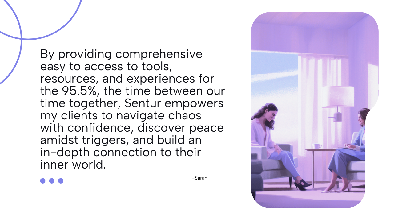 As a co-founder of Sentur and a therapist deeply committed to guiding clients on their journeys of self-discovery and growth, I understand the significance of the 99.5%—the time clients spend outside our therapy rooms each month. This blog post delves into how Sentur transforms this often-overlooked time into a wellspring of self-transformation. Through my personal experiences and insights, I'll showcase how Sentur enriches the spaces between therapy sessions, provides a unified path to self-guided healing, and offers solace during chaos with its "I'm Struggling" tool. Sentur's comprehensive resources empower clients to confidently and consistently navigate their journey of self-transformation.